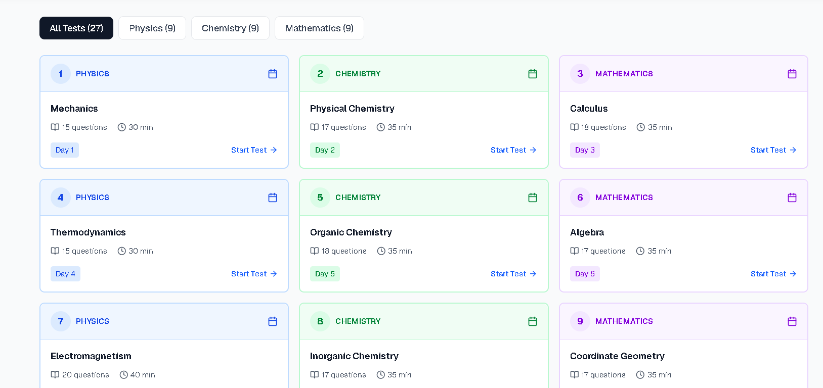 Browse and select from organized topic tests covering the entire JEE syllabus.
